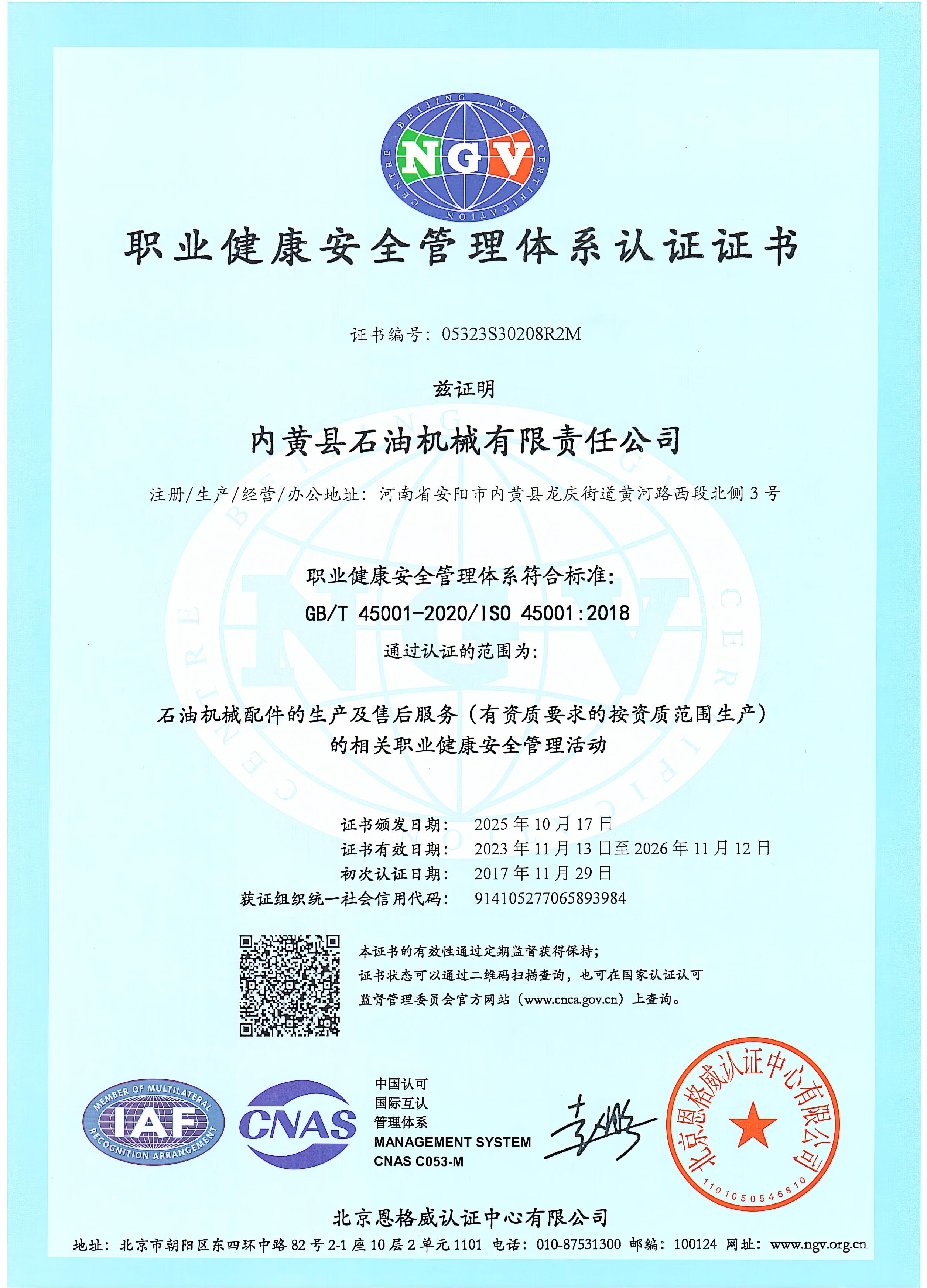 職業(yè)健康安全管理體系認證證書
